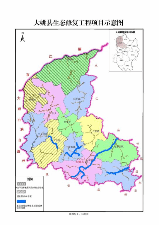 一水:——金沙江干热河谷地带生态保护与修复。包括三岔河、铁锁、湾碧、赵家店、龙街区域。该区域的河谷地带土壤侵蚀严重,植被稀疏,以干热河谷稀疏灌木草丛生态系统为主,对保障“长江经济带”、“金沙江开放合作经济带”建设具有重要的支撑和保障作用,具有水土保持和预防洪灾等作用。对该区域实施保护修复工程,提升森林质量,增加绿化面积,优化景观配置,构建长江流域绿色生态屏障。