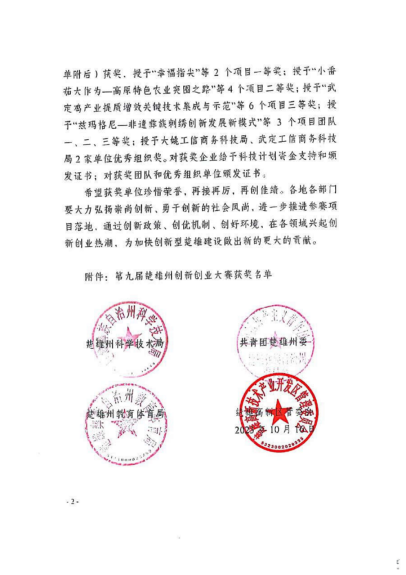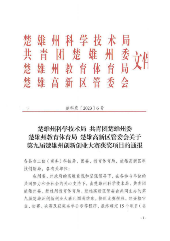近日,楚雄州科学技术局、共青团楚雄州委、楚雄州教育体育局、楚雄高新区管委会对第九届楚雄州创新创业大赛获奖项目进行了通报,大姚县工业信息化商务科学技术局荣获此次比赛优秀组织奖。