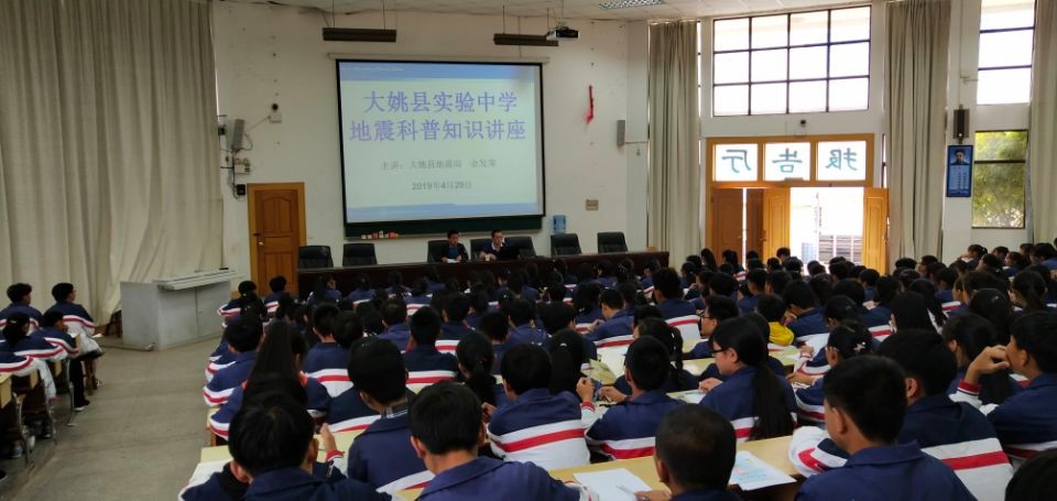 4月29日下午,大姚县地震局到县城实验中学开展地震科普知识培训,学校师生近300余人参加。大姚县地震局震害防御股余发荣老师通过PPT为学生讲授地震产生、地震预警、地震谣言、防震避震、自救互救等方面知识。图文并茂,生动活泼的语言激发了学生学习的兴趣,大家积极发言,课堂气氛活跃,培训达到良好的效果。通过本次培训,大姚县实验中学师生们对地震科普知识有了进一步的了解,防震避震和自救互救能力得到进一步提高。