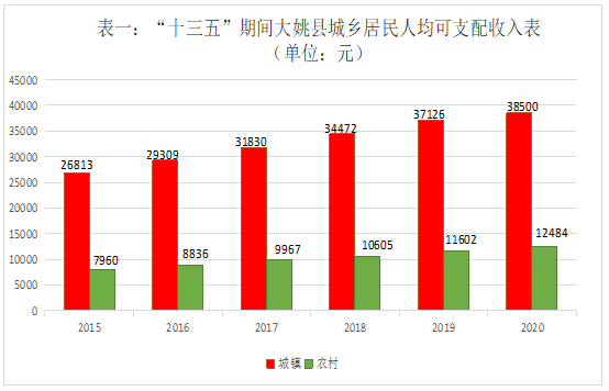 (一)城乡居民收入稳步增长。“十三五”以来,大姚县全体居民人均可支配收入由2015年的12653元,增长到2020年的20351元,累计增长了60.8%,年平均增长9.9%,居民收入稳步增长。其中,城镇居民人均可支配收入由2015年的26813元,增长到2020年的38500元,累计增长了43.6%,年均增长7.5%。农村居民人均可支配收入由2015年的7960元,累计增长到2020年12484元,增长了56.8%,年均增长9.4%。