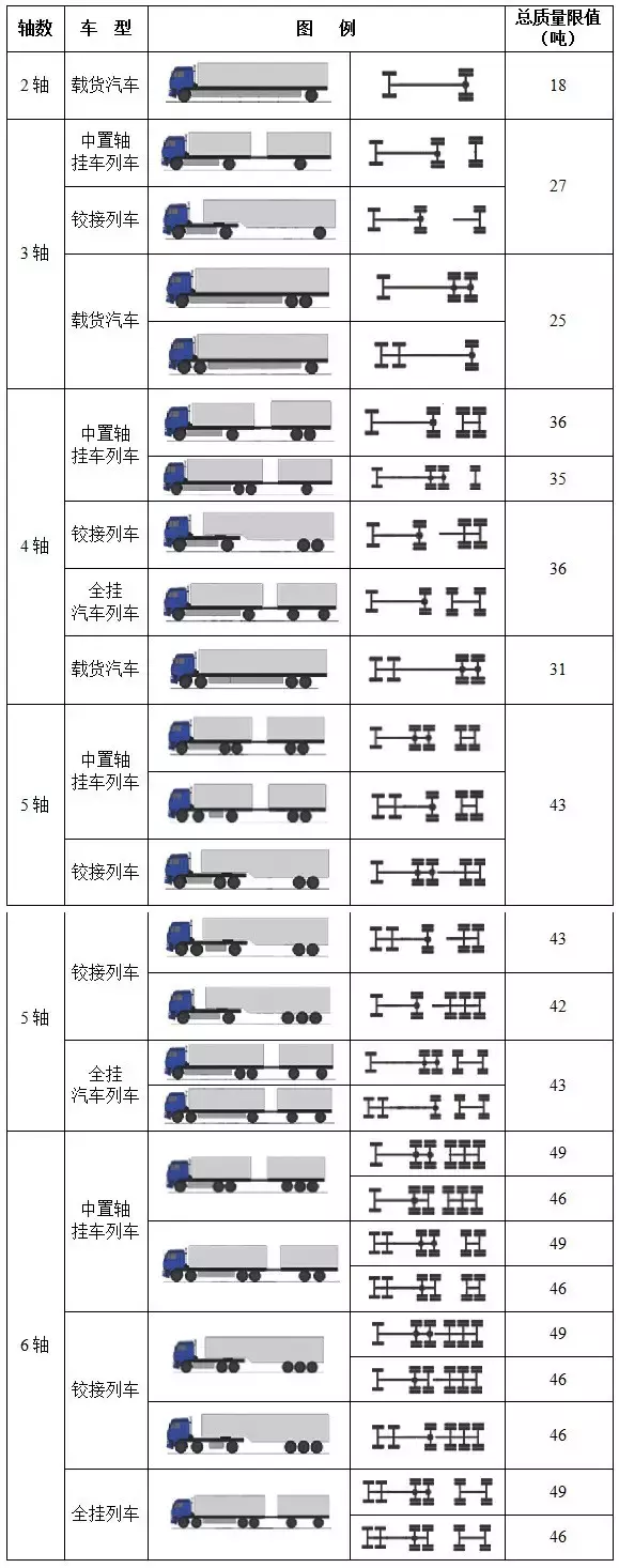 说明:1.二轴货车车 货总重还应当不超过行驶证标明的总质量;2.除驱动轴外,图例中的二轴组、三轴组以及半挂车和全挂车,每减少两个轮胎,其总质量限值减少3吨;3.安装名义断面宽度不小于425mm轮胎的挂车及其组成的汽车列车,驱动轴安装名义断面宽度不小于445mm轮胎的载货汽车及其组成的汽车列车,其总质量限值不予核减;4.驱动轴为每轴每侧双轮胎且装备空气悬架时,3轴和4轴货车的总质量限值各增加1吨,驱动轴为每轴每侧双轮胎并装备空气悬架、且半挂车的两轴之间的距离d ≥1800mm的4轴铰接列车,总质量限值为37吨;5.图例中未列车型,根据《汽车、挂车及汽车列车外廓尺寸、轴荷及质量限值》(GB1589-2016)规定,确定相应的总质量限值;6.对于车 货外廓尺寸超限行为,按照国家有关部门的统一部署,分阶段有步骤地推进,在部署工作开展前,暂不对外廓尺寸进行检查。