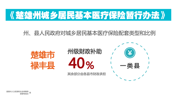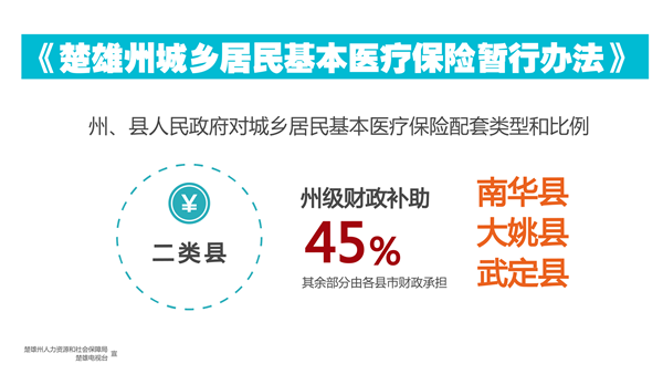 州、县人民政府对城乡居民基本医疗保险配套部分按县市类型和比例配套,一类县:楚雄市、禄丰县州级财政补助40%,二类县:南华县、大姚县、武定县州级财政补助45%,三类县:双柏县、牟定县、姚安县、永仁县、元谋县州级财政补助50%,其余部分由各县市财政承担。