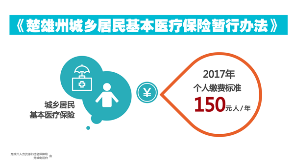 个人缴费方面,2017年,楚雄州城乡居民基本医疗保险个人缴费标准统一按每人每年150元执行。2018年楚雄州城乡居民基本医疗保险个人缴费标准待省明确后于2017年9月1日至11月30日集中开展缴费工作。