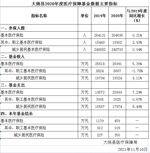 根据《中华人民共和国社会保险法》、《医疗保障基金使用监督管理条例》、《楚雄州医疗保障统计数据使用和公开制度(试行)》、《楚雄州医疗保障局 楚雄州财政局关于2019年度基本医疗保险基金收支计划执行清算结果的通知》、《楚雄州医疗保障局 楚雄州财政局关于2020年度基本医疗保险基金收支计划执行清算结果的通知》相关规定,为进一步加强医疗保障基金监督管理,保障公民的知情权、参与权、监督权,接受社会监督。现将大姚县2020年度医疗保障统筹基金收入、支出、结余等决算数据主要指标公开通告如下: