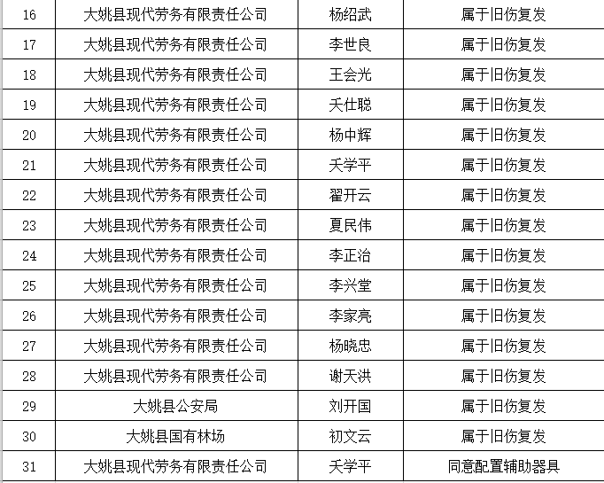 大姚县2024年一季度劳动能力鉴定结论公示