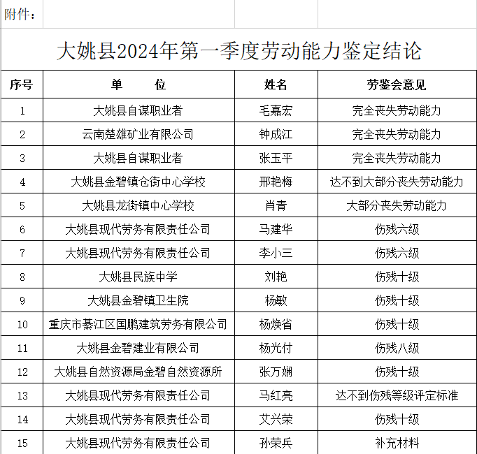 附件:大姚县2024年一季度劳动能力鉴定结论