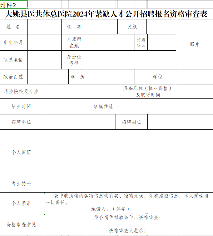 (1)《大姚县医共体总医院2024年紧缺人才公开招聘报名资格审查表》(附件2),电子版照片要求小一寸白色底版彩色近期标准证件数码照;