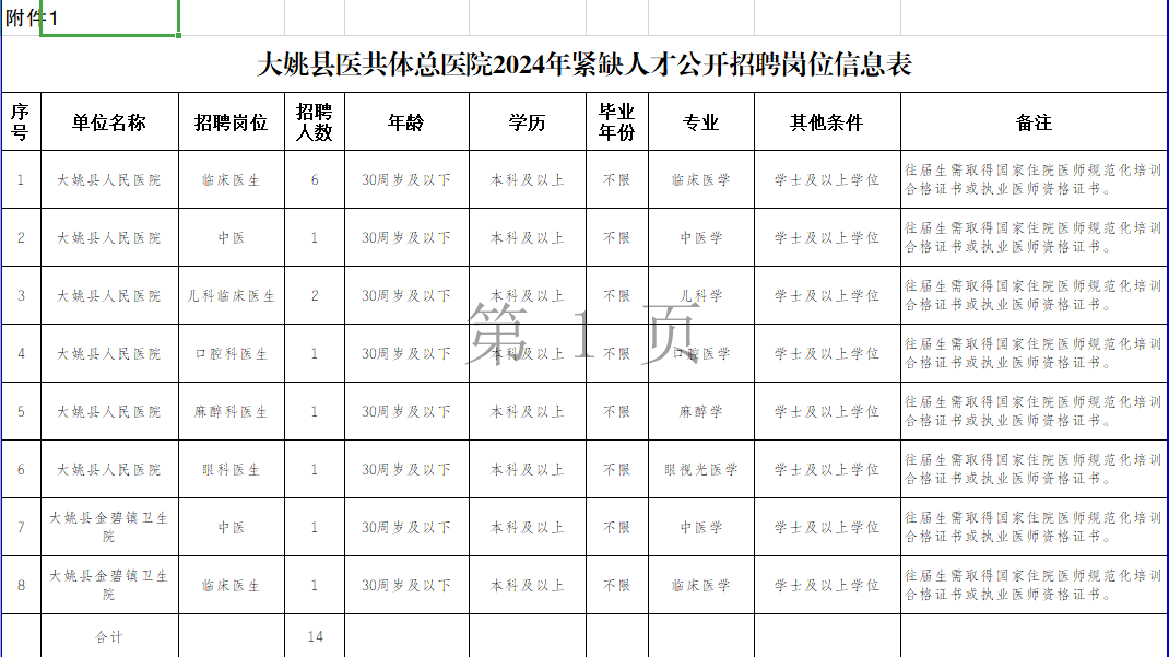 为进一步加强全县卫生人才队伍建设,促进卫生健康事业高质量发展,根据《楚雄州卫生健康事业高质量发展三年行动方案(2023-2025年)》和《楚雄州促进卫生健康人才队伍发展若干措施》文件精神,大姚县紧密型医共体总医院公开招聘紧缺专业技术人才14名,现将有关事项公告如下。