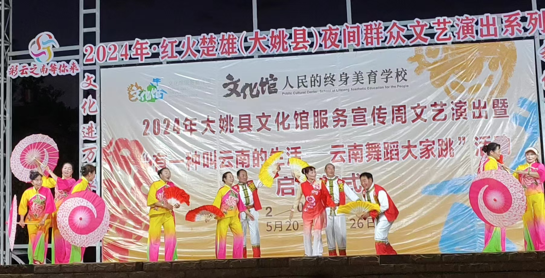 为更好发挥大姚县文化馆对推动公共文化服务水平高质量发展的重要作用,提升广大群众对公共文化服务的知晓度、参与度和美誉度。近日,2024年大姚县“文化馆服务宣传周”广场舞展演活动在核桃文化产业园广场举行。