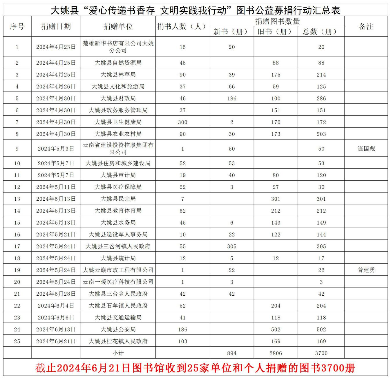 自今年“4.23”世界读书日起,向社会各界、机关企事业单位、爱心人士发出“爱心传递书香存·文明实践我行动”图书公益募捐行动倡议。倡议一经发布,就受到各乡镇人民政府,县级各部门、企事业单位大力支持,积极参与。2024年4月23日至今,大姚县图书馆共收到全县25家单位和个人捐赠的图书3700册。受赠图书种类丰富,涉及政治、法律、文学、历史、社会科学等。