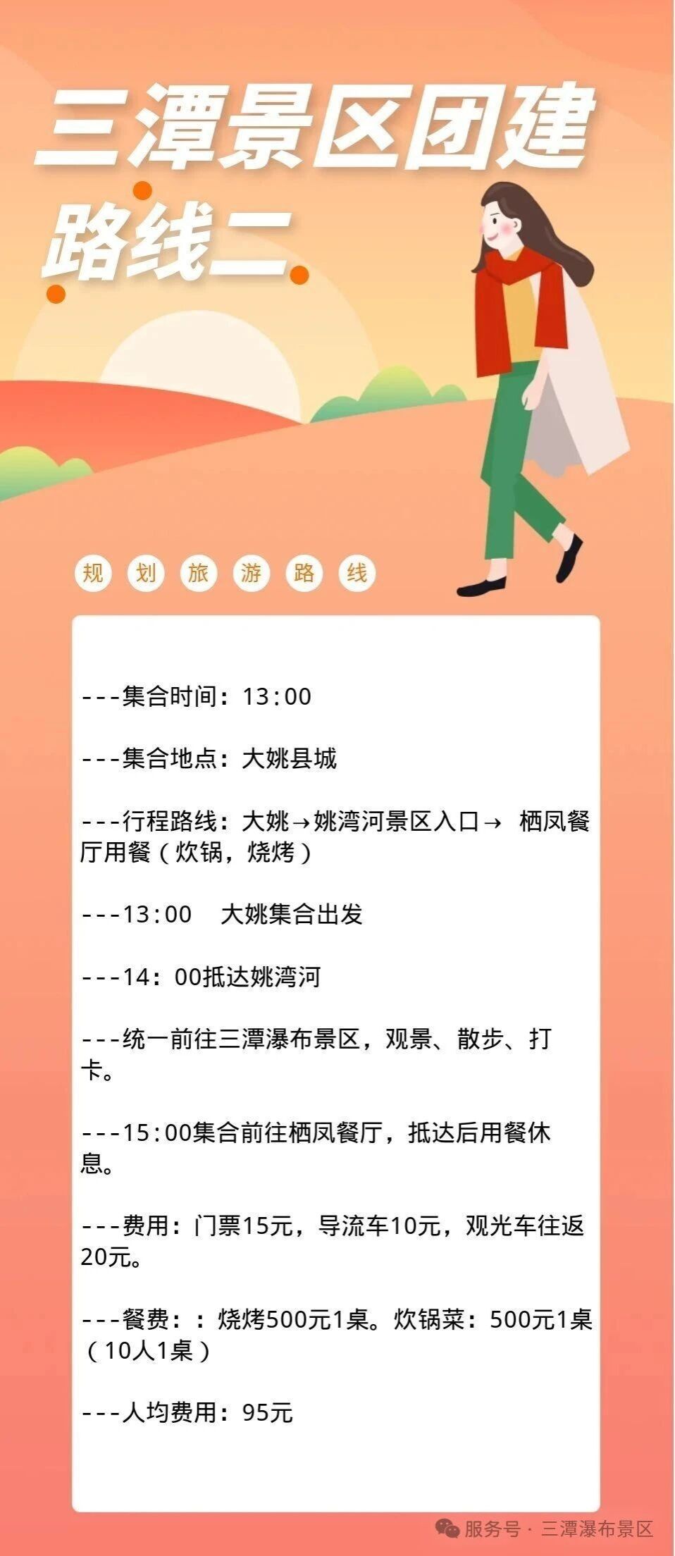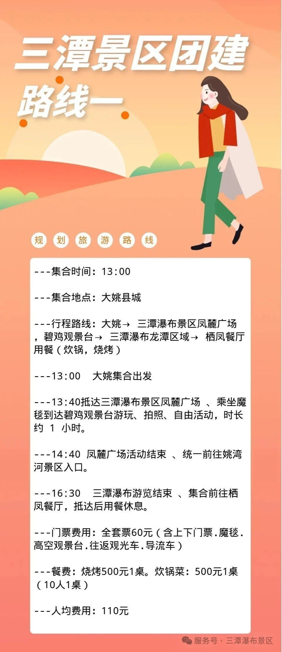 团建还在搞老套的聚餐KTV?还在为众口难调的活动方案头疼?别愁了!三潭瀑布景区的两条一日游线路,直接把美景、美食、美照和团队欢乐打包送到你面前。人均不到一顿大餐的钱,就能收获一整个峡谷的尖叫与欢笑,这性价比,绝了!