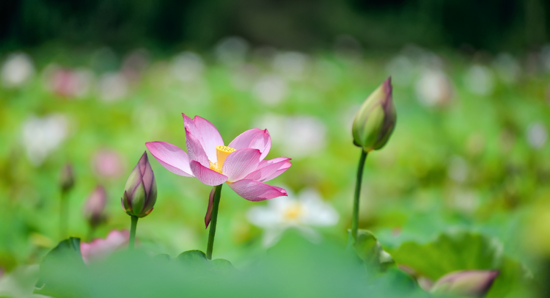 水面荷花绽放,红荷嫣然如霞,外加星星点点的睡莲,形成“接天莲叶无穷碧,映日荷花别样红”的景观,为炎热的夏天增添几分悠闲惬意