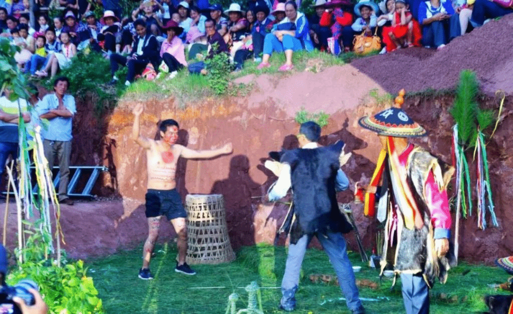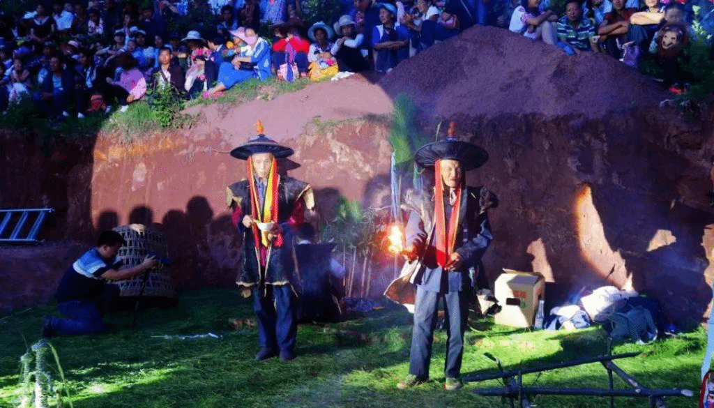 为什么赵家店火把节是在农历六月二十五日呢?这源于一个凄美的传说:相传很久很久以前,大姚县赵家店的红山脚下彝族寨子有个聪明美丽、贤惠善良的姑娘诺娜,她和打苴基地方英俊勇敢的小伙子阿查倾心相爱着。而阴险狠毒的山官头人魔哈四处选女作恶,妄想霸占山茶般秀美的诺娜为妾。在魔哈的淫威下,英勇的阿查,以弱胜强,以精湛的技艺战胜了险恶的魔哈。最后魔哈恼羞成怒,用巫术轰裂了土猪梁子,阿查不幸堕落深渊,后经众乡亲多方搭救才脱离险境。