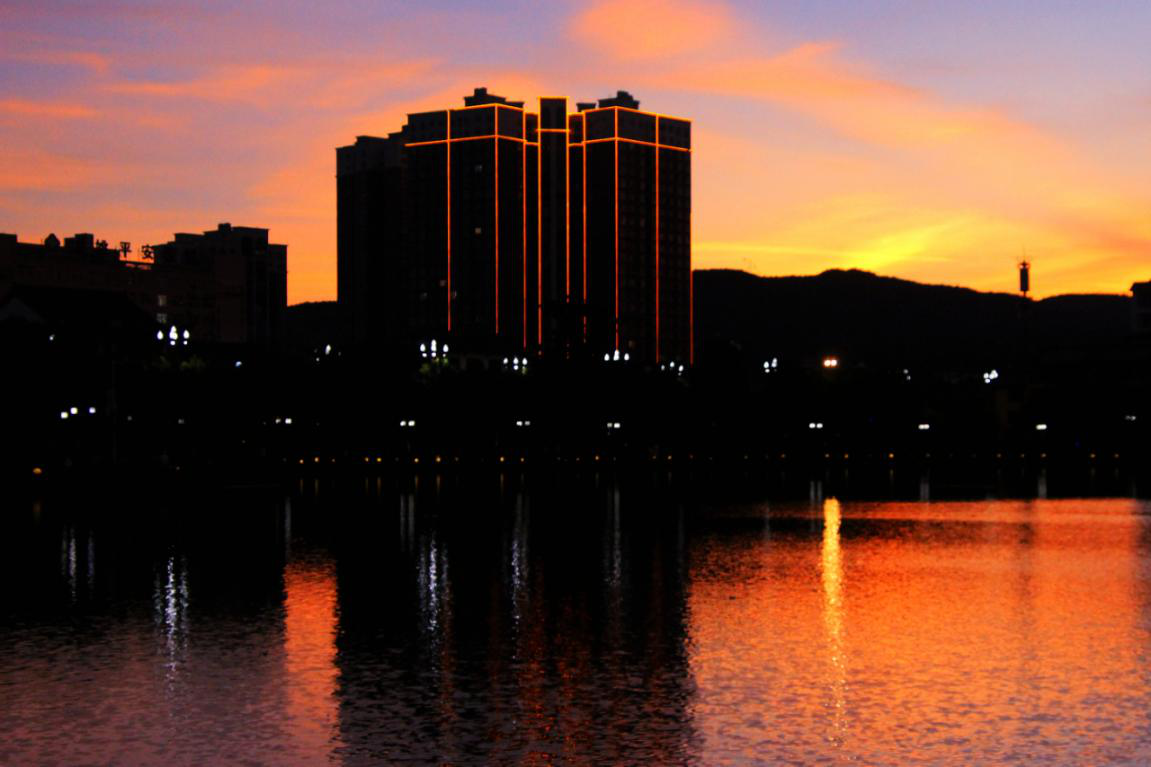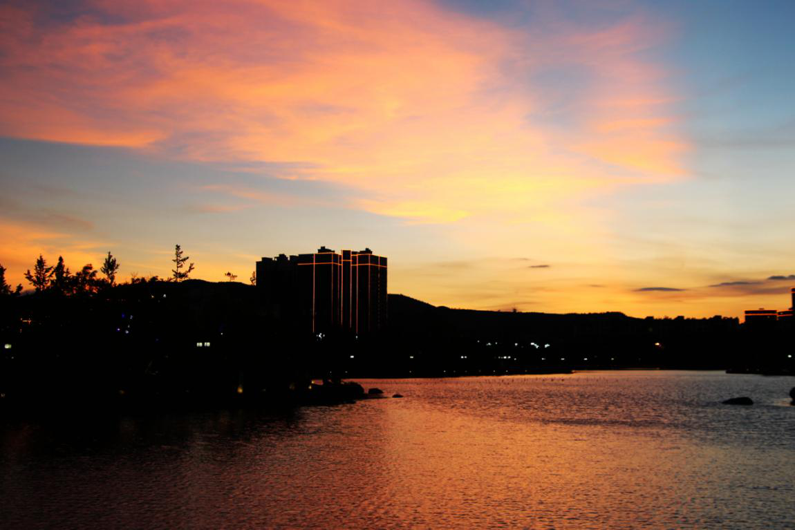 夏日,蓝天白云下的大姚蜻蛉湖水天一色,美不胜收。傍晚时分,落日余晖幻化出美丽的焰霞,染红了天空。城市灯火、公园绿荫与晚霞相互交映成趣,构成了一幅“生态优美、环境宜居”的城市新画卷。