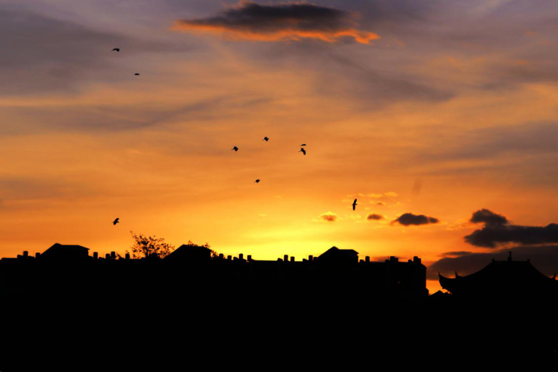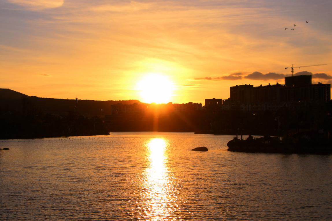 在色彩浓郁的晚霞照射下,蜻蛉湖的各个角落就像被镀上了一层柔和的滤镜。随着夕阳渐渐西下,蜻蛉湖满湖跃金,展现着柔美的线条,衬托出深沉而壮阔的意境,晚风掀起湖面点点波澜,粼粼波光渐欲迷人眼。水面上空,飞鸟唱晚,诗情画意,好一幅“落霞与孤鹜齐飞”的暮色图。我看过无数关于夏日的诗文,都不及这一刻唯美的落日黄昏。
