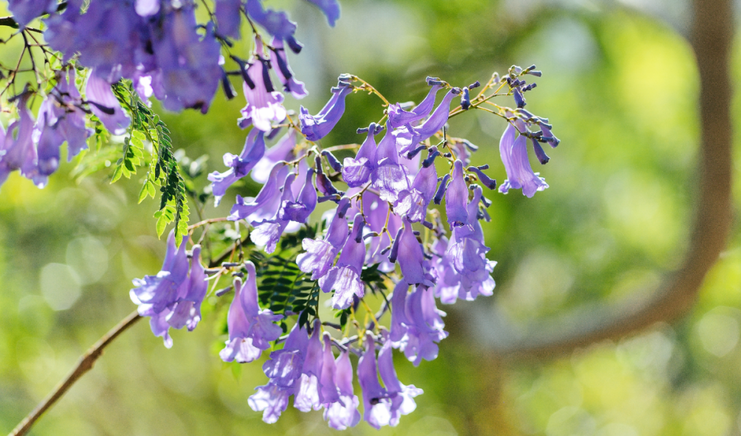 放眼看去,蓝紫色的花朵与翠绿的枝叶交相呼应,给人一种梦幻的视觉感受。花开时,一串串花朵盛开得空幽而烂漫;风起时,花瓣顺势落下,或落在肩头,或落在地面,成为另一种点缀。蓝花楹凭借她那种婆娑雅致、亭亭清清、幻紫幻蓝、秀丽清雅的花朵让人“一见钟情”,这不仅仅是人们对一棵树的依恋,更是留恋那种简单悦目的感觉,那种蓝却不忧郁,反而明朗宁静。
