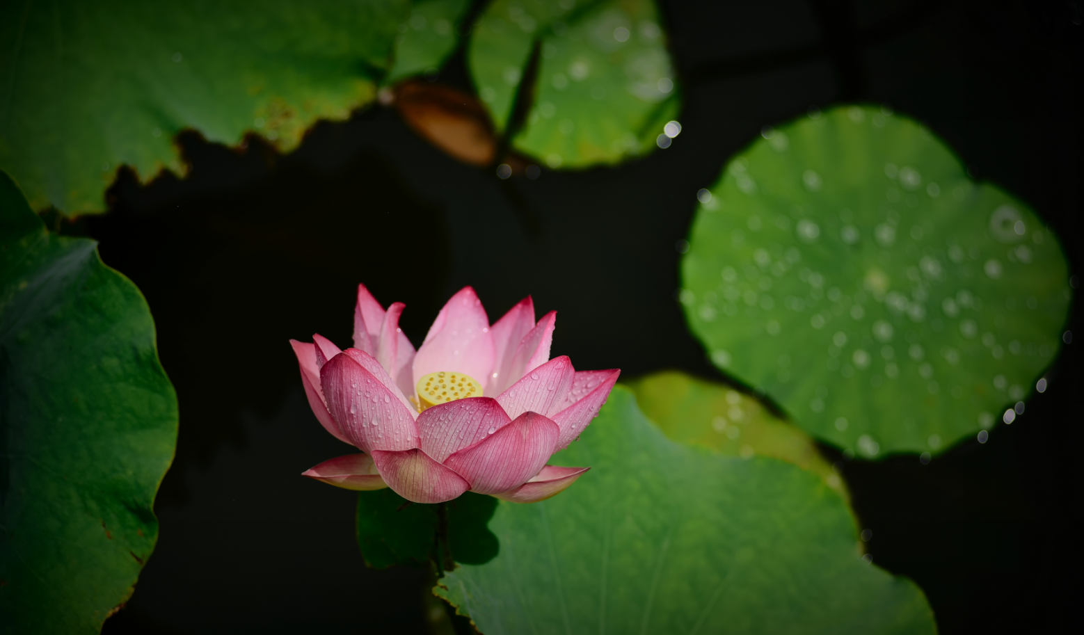 阴雨天的荷花十分柔美,在雨水的沐浴下,满池子湿漉漉的绿色,珍珠般的雨滴落在荷叶上,荷叶兜着雨水,枝干压弯了腰,荷花显得更加清鲜明媚,色泽饱满,袅娜多姿,如诗如画,如梦如幻,惊艳了时光……