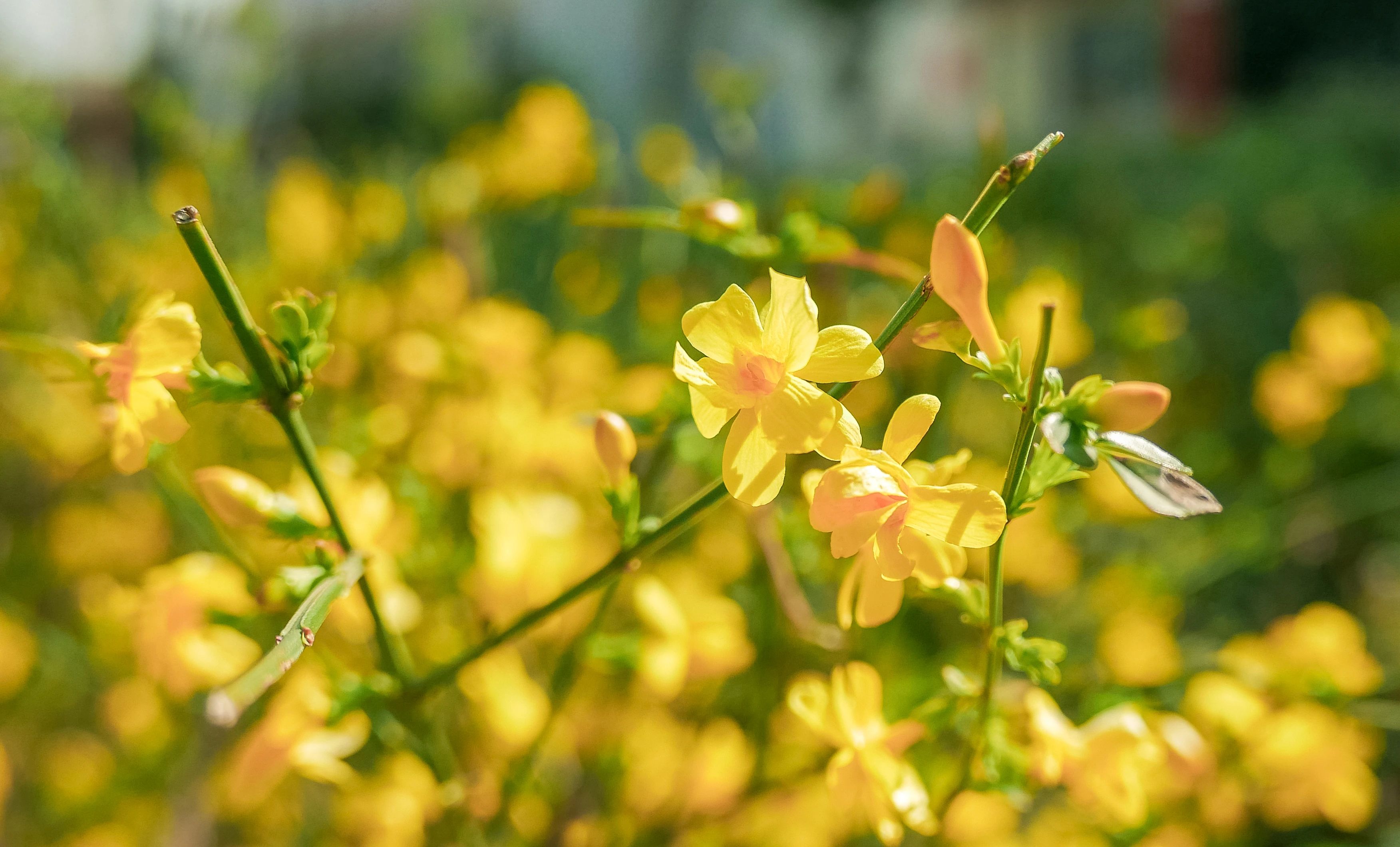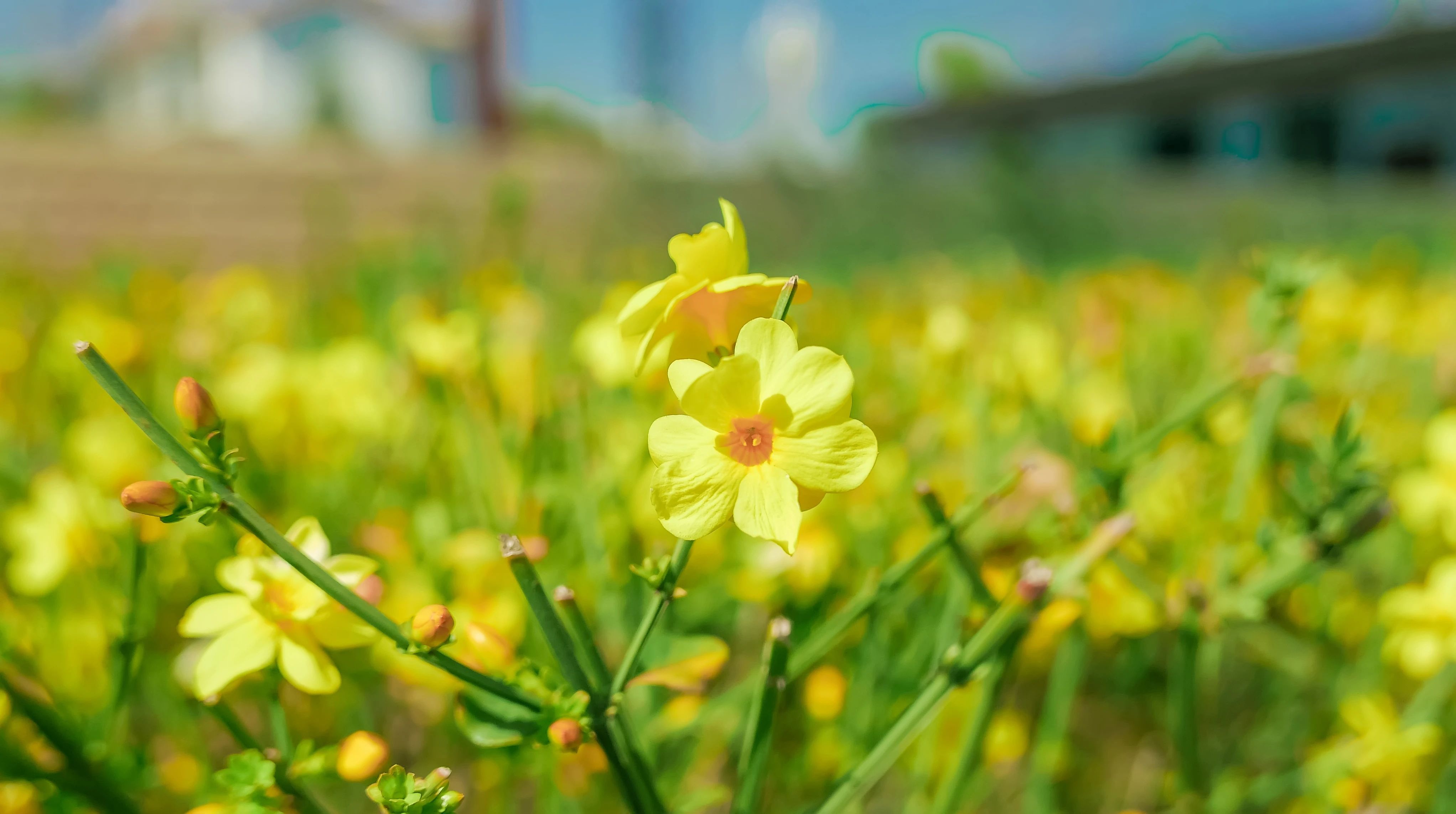 春风轻拂,迎春花含苞待放、俏丽迷人的枝条下的花蕾,被点点黄色装扮。一个个小喇叭似的泛着梅花朵般的花瓣,纯黄纯黄的,成了金色的花海。当微风吹过时,迎春花随风摆动,宛如在诉说着春天的故事。迎春花清新淡雅,不张扬却足以让人沉醉其中,更像是春天的气息,让人感受到大自然的温暖与宁静。