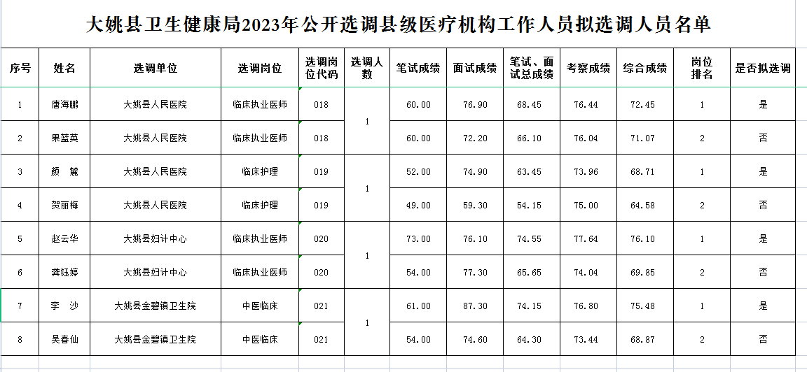根据《大姚县卫生健康局2023年公开选调县级医疗机构工作人员公告》要求,大姚县卫生健康局2023年公开选调县级医疗机构工作人员经公开报名、资格审查、征求意见、笔试、面试、考察等程序,现将拟选调人员名单予以公示。