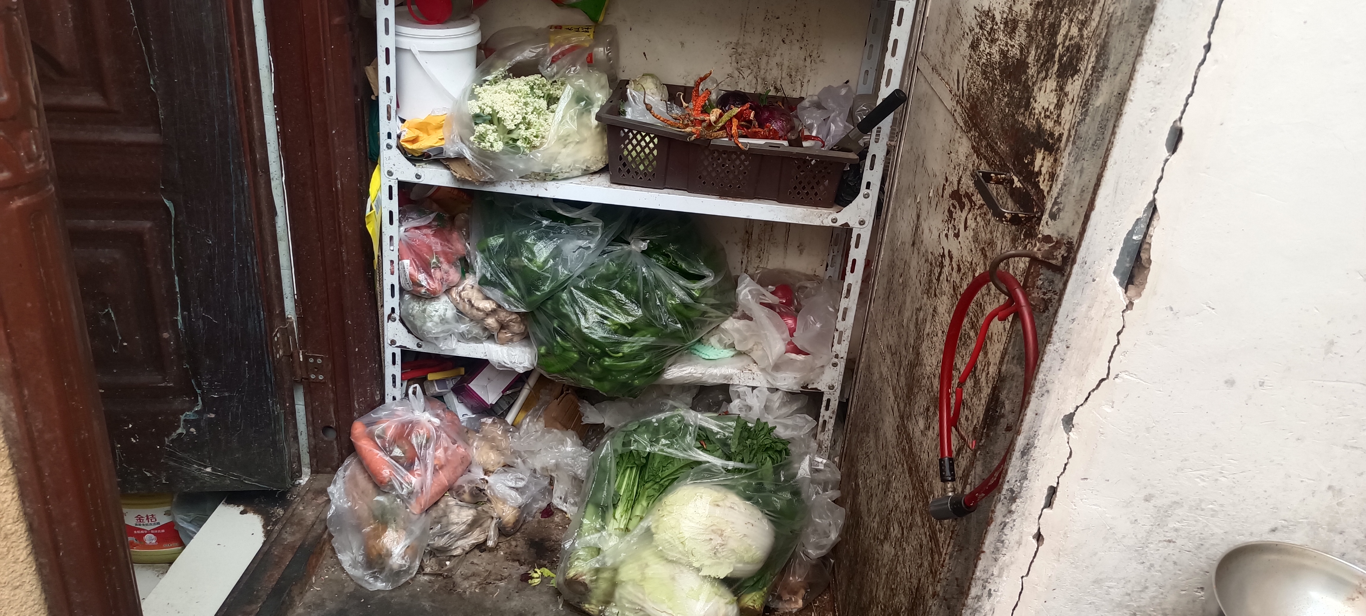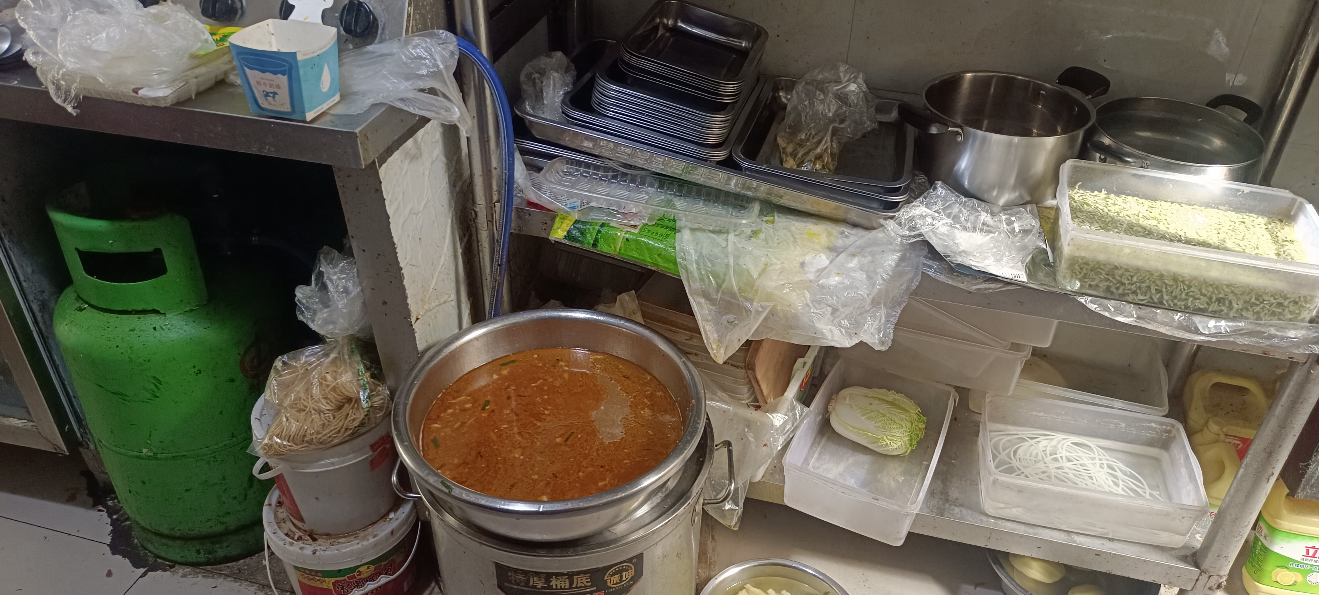 1.后厨房物品摆放杂乱,纱窗、抽油烟设施灰尘、油污严重污染;