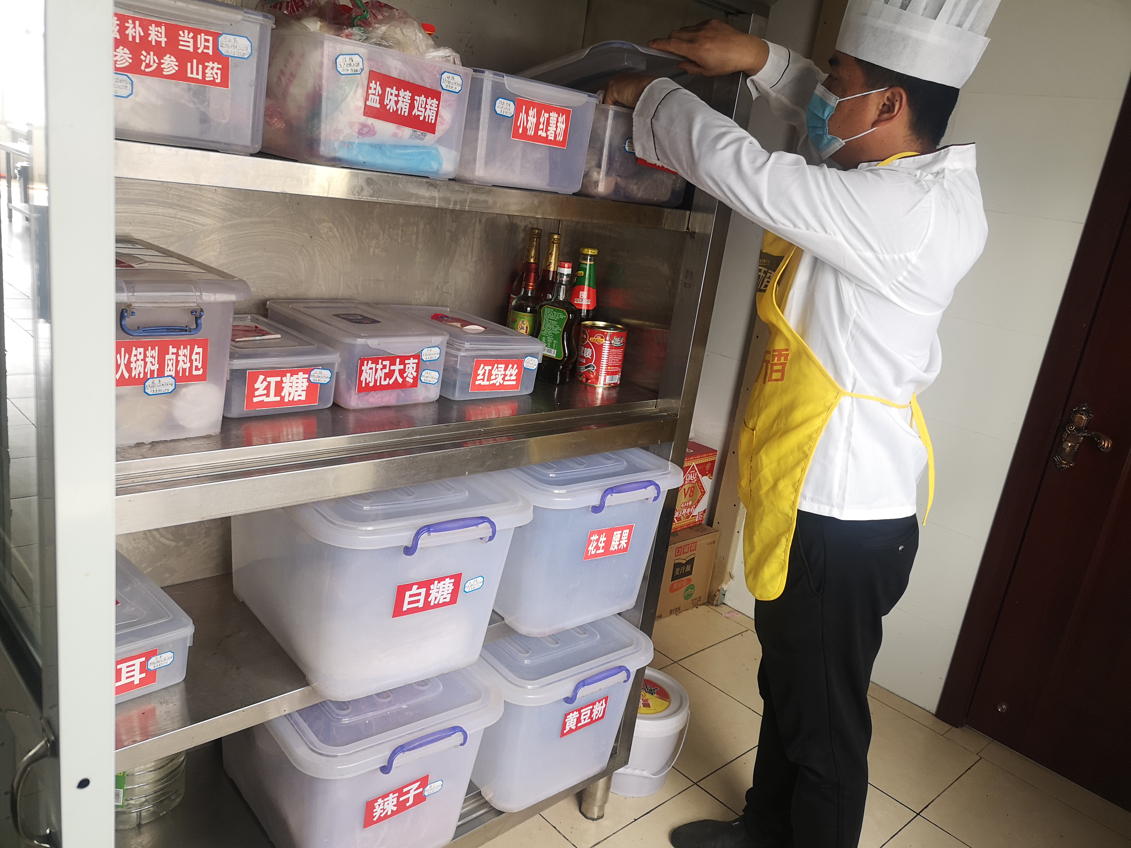 4.食品及原料的贮存分类分区,摆放整齐,标签符合规定,并定期清理;