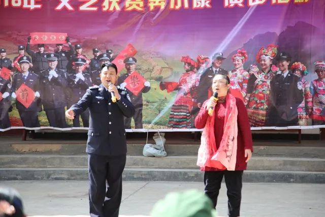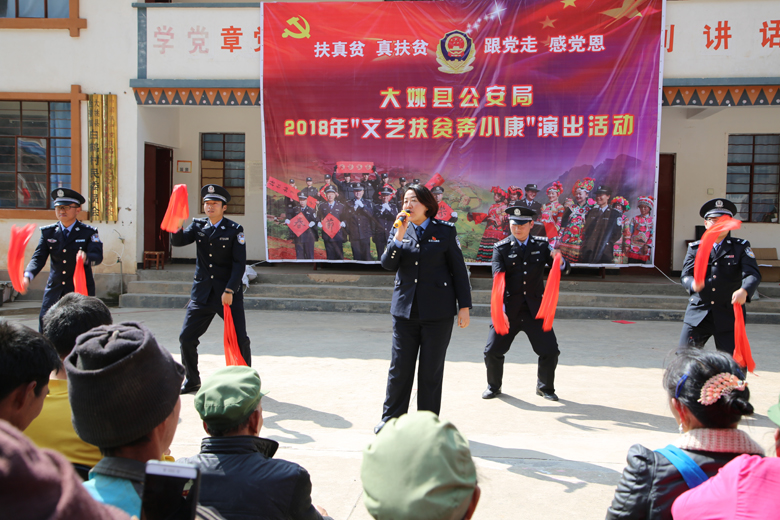 为全面贯彻落实党的十九大精神,打赢脱贫攻坚战,进一步巩固和发展警民关系,加深公安机关与贫困群众间的情感,营造“警爱民、民拥警、警民鱼水一家亲”的良好氛围。2月7日至8日,大姚县公安局党委副书记、政委董勇带领县公安局“文艺扶贫奔小康”小分队分别到大姚县金碧镇白鹤、锁北村委会为父老乡亲带来一场由县公安局自编自导自演的“文艺扶贫奔小康”精彩演出,向彝家山寨贫困群众送上一场文化视听盛宴,带去党和政府对贫困群众的新春祝福。
