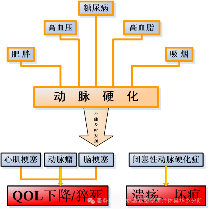 动脉硬化是一种非炎症性的病变,主要危险因素有高龄、高血压、高血脂、肥胖、糖尿病、吸烟、运动过少、家族史等,主要累及体循环系统的大动脉,如主动脉、冠状动脉、脑动脉、四肢动脉等,可以导致动脉管壁增厚、变硬、管腔狭窄,可发生冠心病、脑卒中、下肢动脉闭塞等疾病,严重者可危及生命。脑动脉硬化可引起脑卒中(中风)、脑梗塞或脑出血;眼底动脉硬化可引起眼底供血不足、眼底出血;冠状动脉硬化可引起冠心病、心绞痛、心肌梗死;肾动脉硬化可引起高血压和肾功能衰竭;肢体动脉硬化、阻塞可引起四肢麻木、疼痛、坏疽、糖尿病足等。所以我们要提高对动脉硬化的认识,并尽量做到早期诊断、早期治疗。