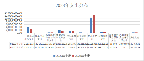12.农林水(类)支出12478397.63元,占一般公共预算财政拨款总支出的64.38%。主要用于农村基础设施建设3040600.00元、行政运行382902.99元、农村道路建设80000.00元、农田建设11440.00元、其他普惠金融发展支出5000.00元、水利工程运行与维护443603.16元、生产发展4648000.00元、对村民委员会和村党支部的补助2298301.62元、一般行政管理事务31626.77元、事业机构549835.61元、事业运行987087.48元;